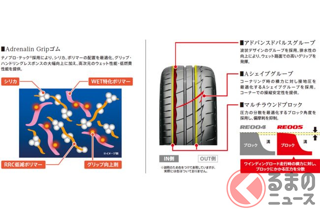 一方で、同時に発表された「POTENZA Adrenalin RE005」は、スポーツカーのみならず、日常から週末のワインディングや高速道路まで走りを楽しみたいユーザー向けに、優れた操縦安定性と運転の楽しさを感じながら「気持ちよく走る」ことを目指したタイヤです。