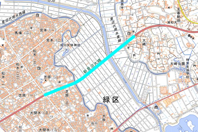 いっぽう、浦和ICから浦和駅方面に行くには、途中で芝川という川を渡りますが、この橋に架かるのが新見沼大橋有料道路となります。