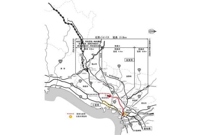 北勢バイパスは、伊勢湾岸道のみえ川越ICがある三重県川越町を起点に、東名阪道に沿って走行し、三滝川で南進して四日市市采女(うねめ)町まで敷設予定の総延長21kmのバイパスです。