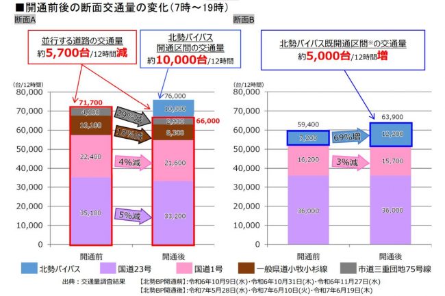 国土交通省は、国道1号「北勢バイパス」における開通区間の交通状況および開通効果をまとめたレポートを公表しました。
