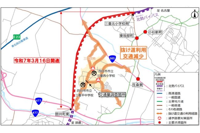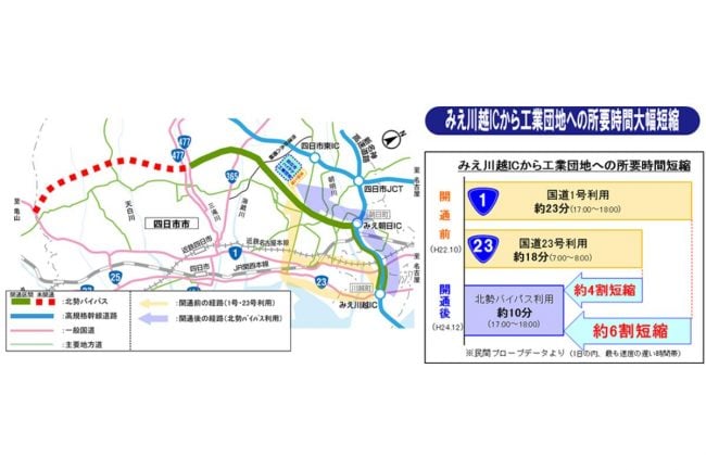 国土交通省は北勢バイパスの完成によって「四日市市内の国道1号、国道23号等の渋滞緩和、災害に強い道路機能の確保及び地域活性化の支援等の効果の発現」に期待を寄せているとしています。