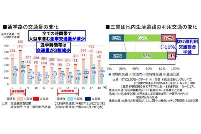 北勢バイパスの開通後に、周辺にある小中学校の通学路で交通量調査を実施したところ、昼間12時間あたりの交通量が全体的に減少。通学時間帯の交通量は3割減少するなど、一定の効果が出ている様子。