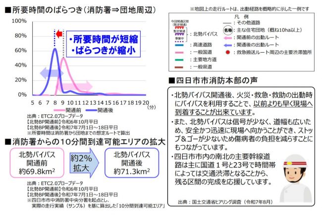 四日市市中消防署中央分署より一定の方面へ出動時、北勢バイパスを利用することで所要時間が短縮しているというデータが出ています。