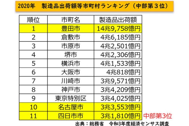 四日市や鈴鹿市などを含めた「北勢地域」は製造業がさかんで、製造品出荷額等市町村ランキング(2020年)においては、中部地方では四日市市は豊田市、名古屋市に次ぐ第3位にランクインしています。