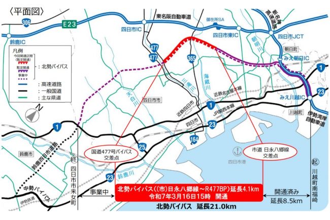 現在の工事進捗は、2025年3月に国道477号の「四日市バイパス」交差点までの延長4.1kmが開通し、みえ川越ICから四日市市内が走りやすい線形で直通。全体の約60%となる延長12.6kmが開通しています。
