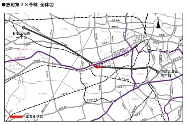 東京都では環状線と放射線、補助線という3種類に分類した道路整備が進められており、放射23号線は港区青山3丁目を起点とし、渋谷区および世田谷区を経て、杉並区松庵1丁目に至る延長約12kmの都市計画道路です。