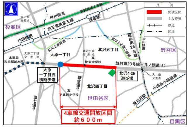 今回4車線交通を開放した区間は、世田谷区北沢4丁目の北沢中学校付近「北沢4-26遊び場」から同区大原1丁目西交差点付近までの約600mの区間です。