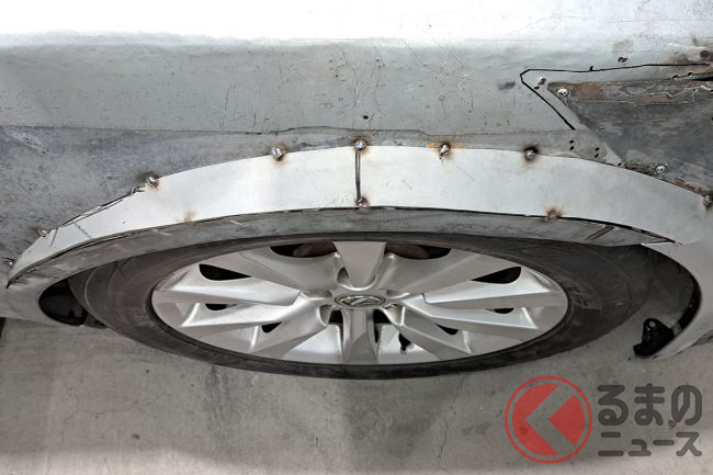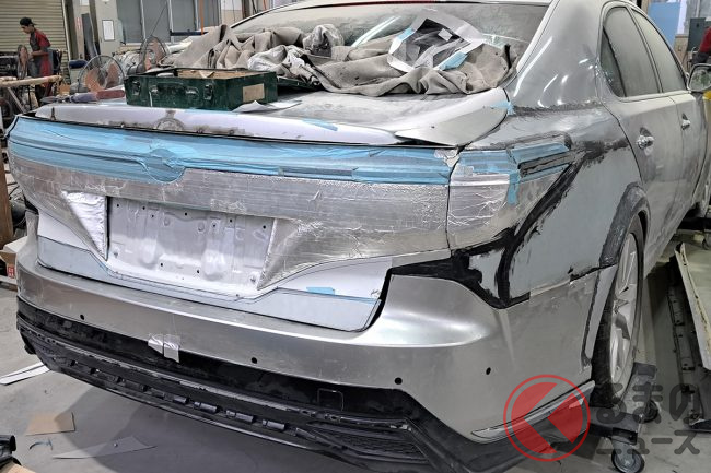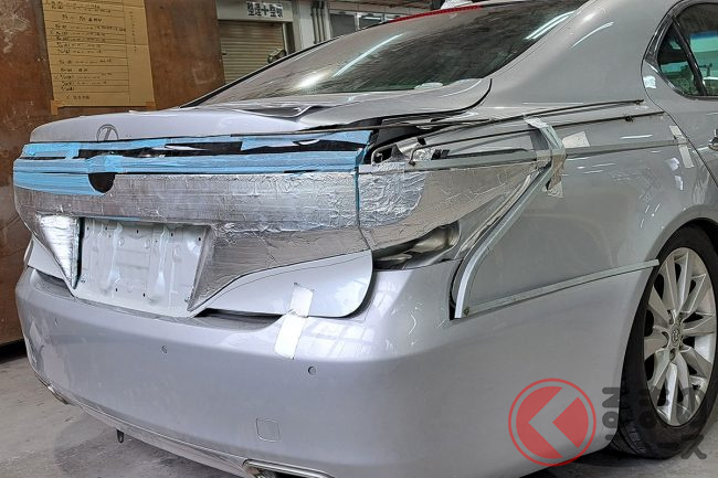 一方、リア周りはまだ大仕事が残る工程です。現行モデルであるレクサス「LS500」のリアバンパーを採用しつつ、ヴェルファイアのテールランプを収めるためにトランクパネルを延長加工する必要があり、その造形は難易度が高いとのこと。