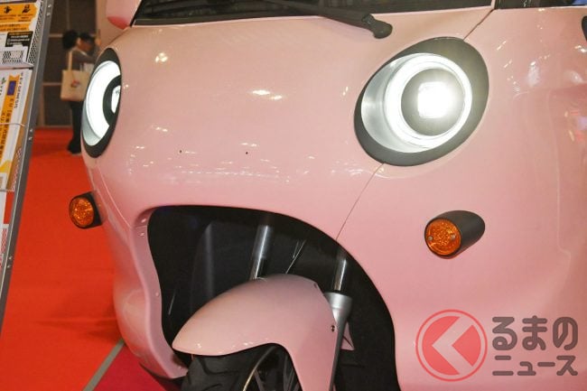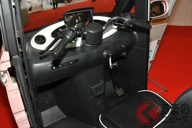 車体は3輪バイク風で、バーハンドルで操作します。ルーフまで続く流麗なフロントウインドウや愛嬌のある丸型のヘッドライトに加え、乗用車風のドアミラーを装備し、安定感のあるエクステリアです。