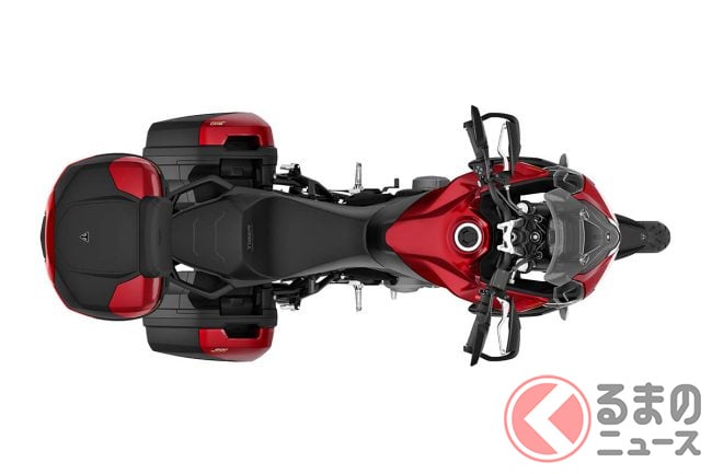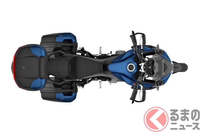 さらに、ツーリングに欠かせないラゲッジシステムも標準搭載されており、アルミ製ラゲッジラックには、ボディと同色のパニアケース(合計57L)と、フルフェイスヘルメット2個を収納できるデュアルバックレスト付きトップボックス(49L)が装着され、合計で106Lという大容量を誇ります。