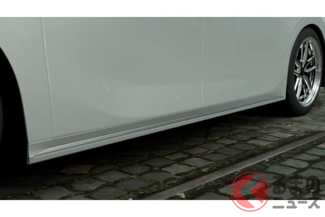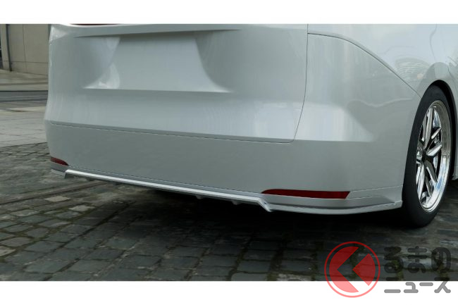 この新作LM用エアロは、フロントスポイラー、サイドステップ、リアアンダースポイラー、ルーフエンドウイング、リアゲートウイング、ボンネットスポイラーの6点を予定しているということで、もともとボディ下部にメッキパーツが備わるLMの雰囲気を損なうことなく、その下に追加するシンプルなスタイルとなっていますが、アドミレイションらしい絶妙なさじ加減で腰高な印象を一気に解消してくれるものとなっています。