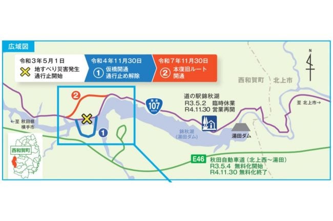 東北地方の両県を横断するように走る国道107号は生活や物流、観光などを支える重要な道路でしたが、2021年3月に発生した地震の影響で、一部区間で地すべりが発生。和賀川沿いの道路が使用不可となり、寸断状態となっています。