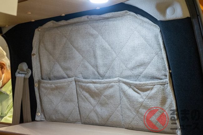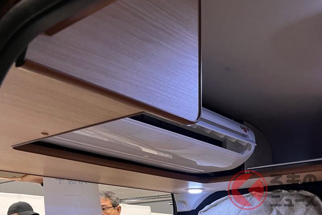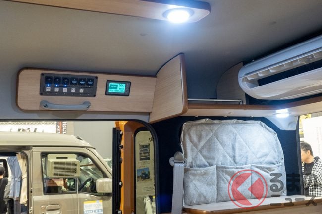 さらに室内の天井には、家庭に付いているような薄型形状の12Vクーラーも用意されています。会場でも実際に稼働しており、涼しい風が車内に流れていました。