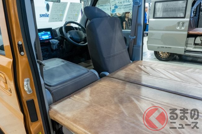 スズキの「“2人”寝られる“快適”軽バン」がスゴい! 全長3.4m級「ちいさな軽ワンボックス」が「車中泊モデル」に! 停止時に「クーラーも使える」スマイルファクトリーの軽キャンパー「オフタイム“ヴィレージュ”」に注目