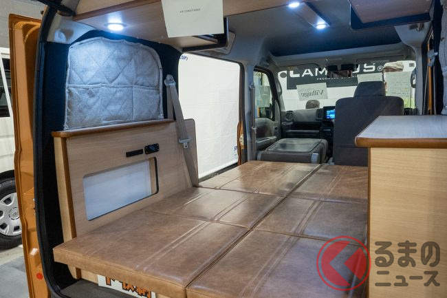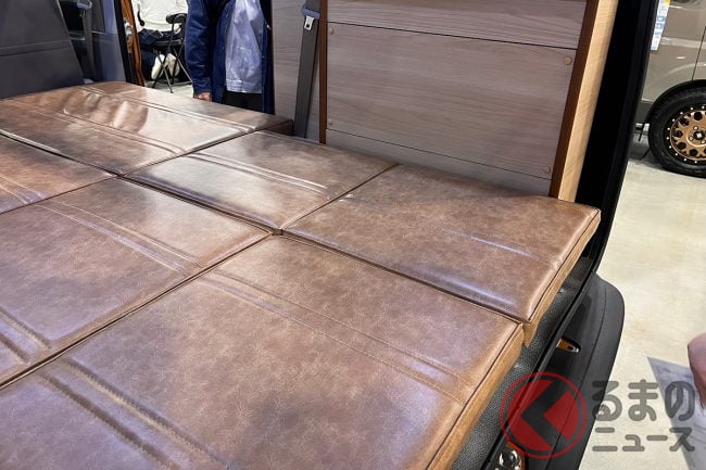 インテリアに目を向けると、ベース車の後部座席を収納した上にフラットなブラウン革調のベッドマットが搭載されていました。