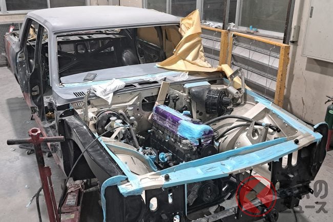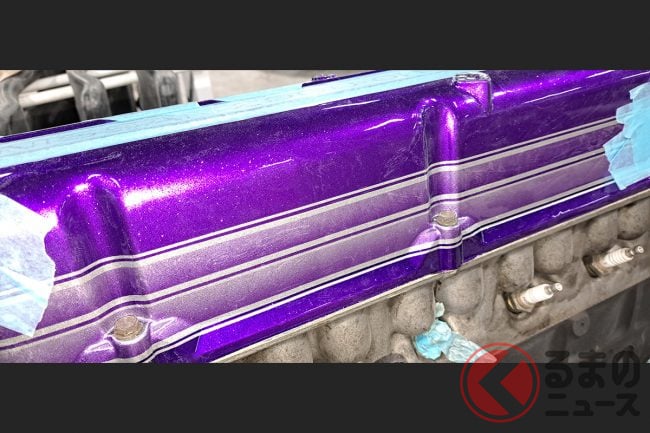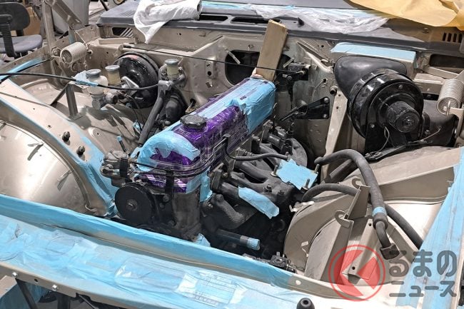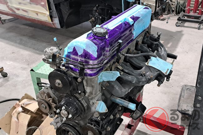 また、レストア作業についてもエンジンルーム、室内フロアの塗装が完了し、エンジンヘッドカバーはアクセントとなるパープルに仕上げたそうです。