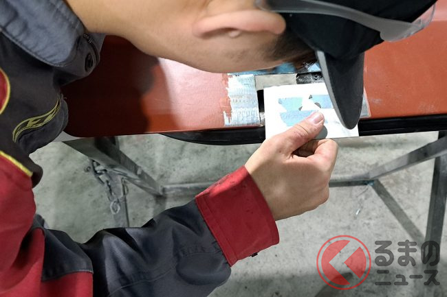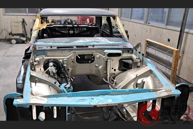 続いてドア内部の塗装に着手し、車体の組み付けを経て、いよいよカスタムペイントに向けたラインテープ貼りへ移行する予定だと報告がありました。
