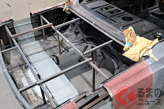 特にリア周りのカスタムでは、トランクの延長作業が佳境を迎えているとのことです。およそ230mm延長して3ナンバーサイズへ拡大し、背負いタイヤを収めるコンチネンタルキットの造形バランスを最適化するための重要な工程だと語ります。