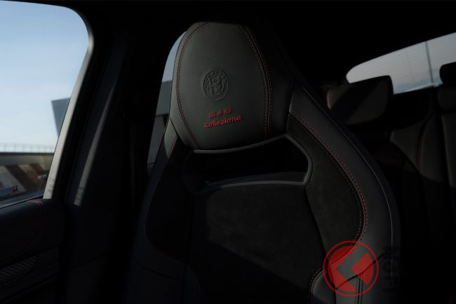また、足回りにはカーボンセラミックブレーキシステムを採用。強力なストッピングパワーを保証すると同時に、焼結アルマイト加工が施されたキャリパーには赤い「Alfa Romeo」のシグネチャーが輝き、足元の美しさも追求されています 。