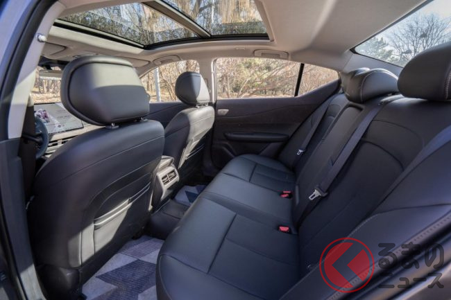 月1万台超を売り上げる中国専売BEV「N7」と同じく、リアは水平基調の左右一体型テールライトを採用、トランクリッド側のレンズ内では「NISSAN」の字が赤く点灯します。