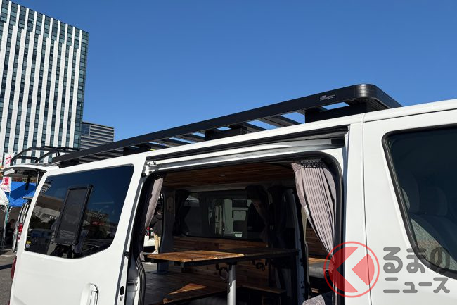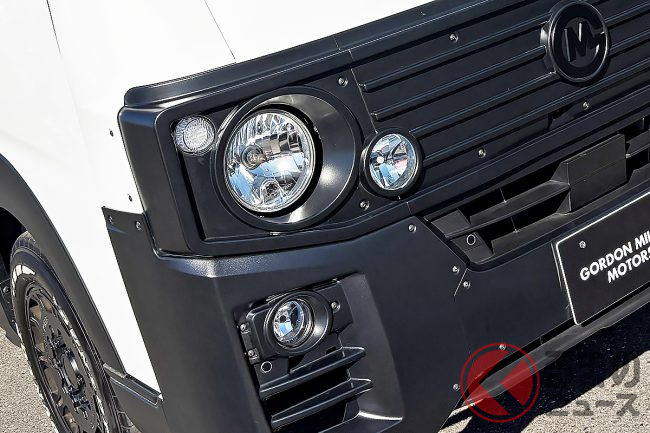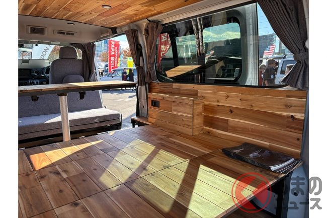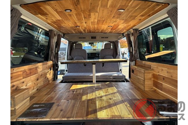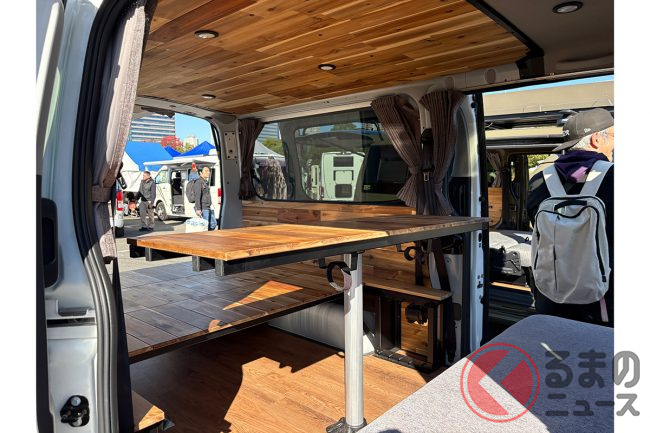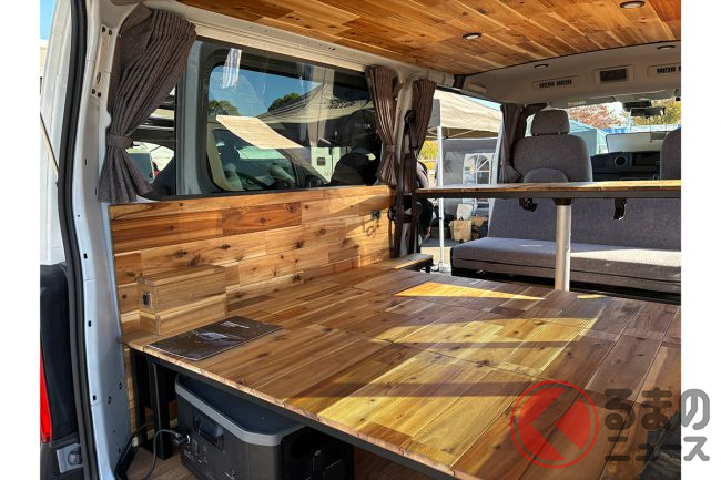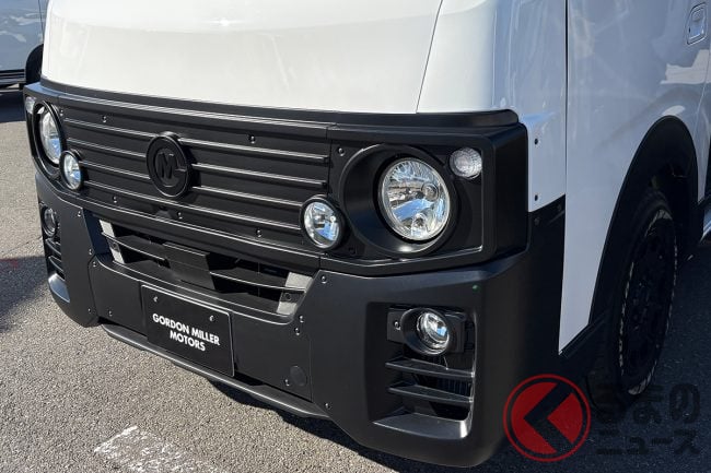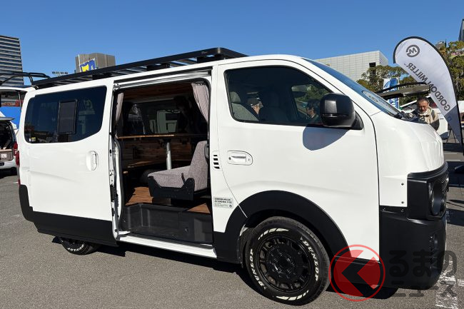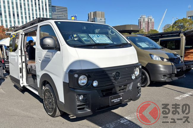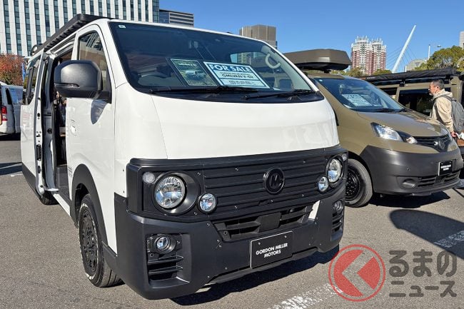 日産の「“家族3人”寝られる」バンがスゴい! 丸目ライトの「旧車顔」×全長4.7m級で「ちょうどイイサイズ」! ブラックマスク&「ウッド内装」もカッコいいゴードンミラーの“車中泊”キャラバン「GMLVAN V-02」に注目