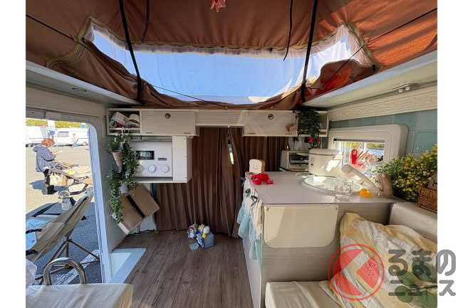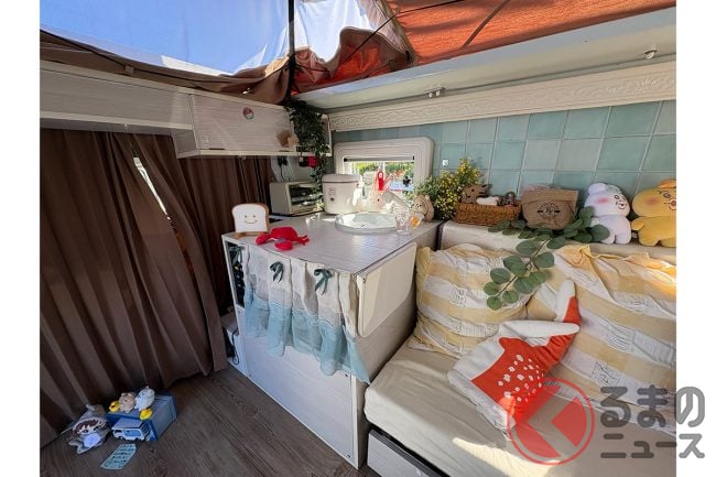 さおりんごさんはこのクルマを2020年春に購入しており、ルーフにはソーラーパネルを備えるほか、リアドアを開けるとポップで可愛らしい内装が広がる仕様でした。