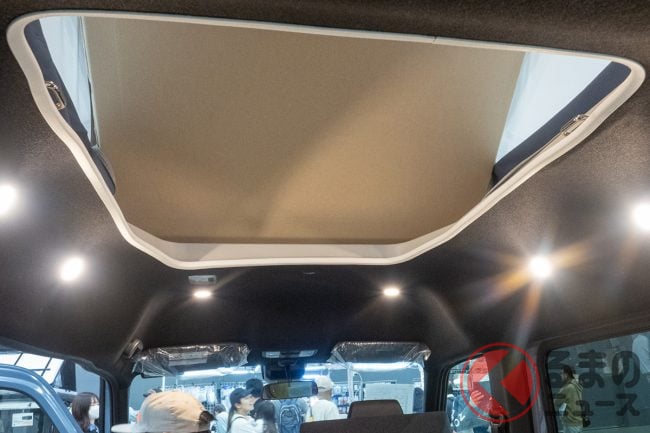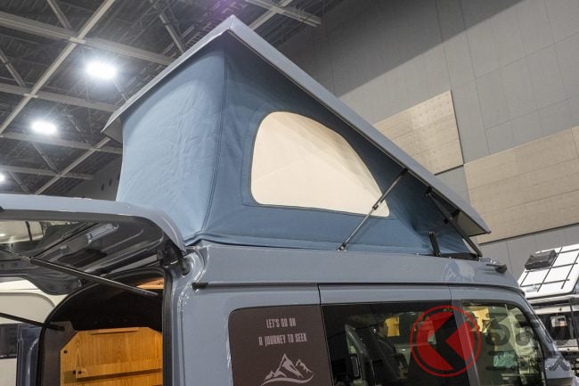 展開すると長さ1800mm×幅1050mmのベッドルームに拡張され、大人2名が就寝可能になります。会場の担当者によると、このポップアップルーフは今後、より防水性を高めた仕様になるそうです。