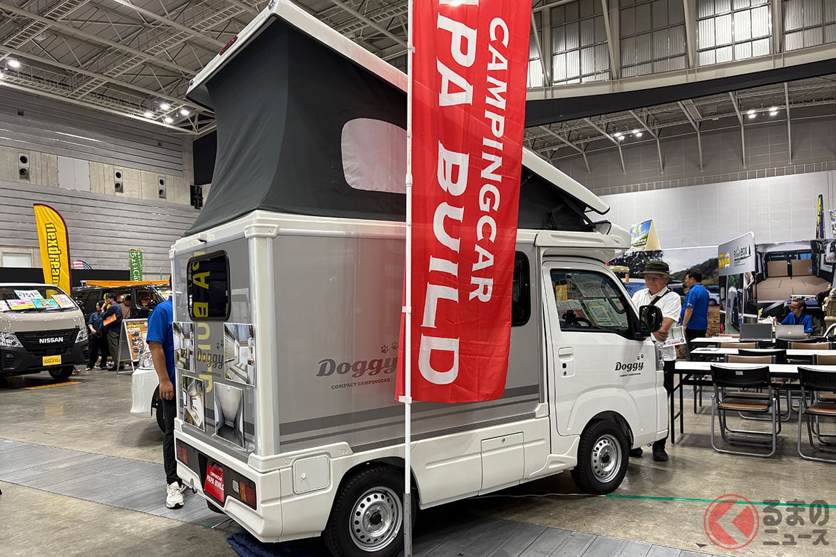 外観はアルミボディを採用したスクエアなデザインで、軽トラックベースとは思えないほどの存在感を放っています。