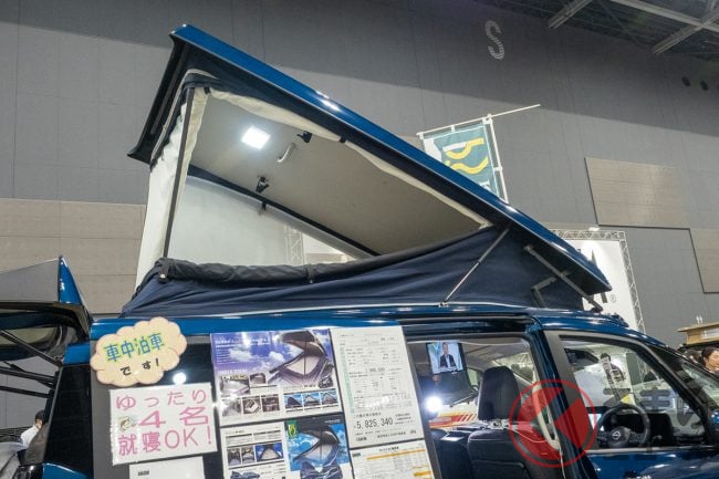 会場の説明スタッフに話を聞いたところ、セレナP-SVは「商用車ベースでは搭載されていない(先進運転支援機能)プロパイロットなどを装備するセレナの良さを残しつつ、ポップアップルーフを付けたことで、キャンプやレジャーに対応するのを目指した」そうです。