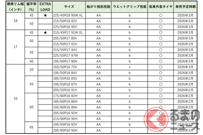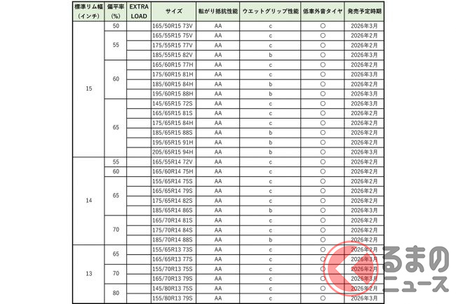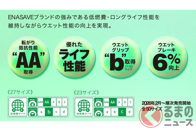 住友ゴム工業は2025年12月9日、ダンロップブランドから「ENASAVE EC205」を2026年2月より順次発売すると発表しました。低燃費性能とロングライフ性能、耐摩耗性能を維持しながら、ウエット性能を強化したタイヤです。