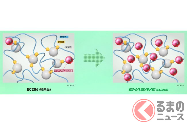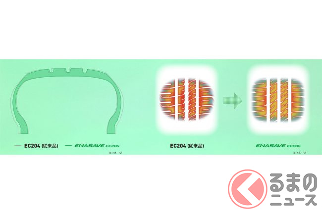 新開発ゴムはグリップ向上添加剤が増量され、これによりゴムの粘り気が増加。ウエット路面でもより粘り強く密着し、従来品(ENASAVE EC204)と比較してウエットブレーキ性能が約6%向上しました。なお、全50サイズ中27サイズがウエットグリップ性能”b“を取得しています。