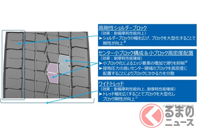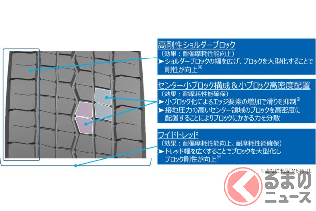 また、接地圧が集中しやすいセンターブロックを小型化し、これを高密度に配置することで接地圧を適切に分散し、耐摩耗性能を一段と向上させています。さらに、同社独自のトラック・バス用タイヤ開発基盤技術「e-balance(イー・バランス)」を活用し、ブロック剛性を最適化。接地形状の安定化により転がり抵抗を低減し、燃費効率にも配慮しているとのことです。