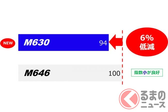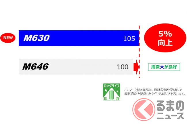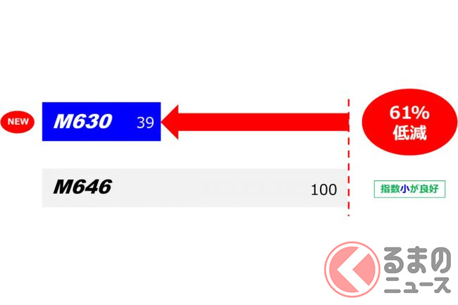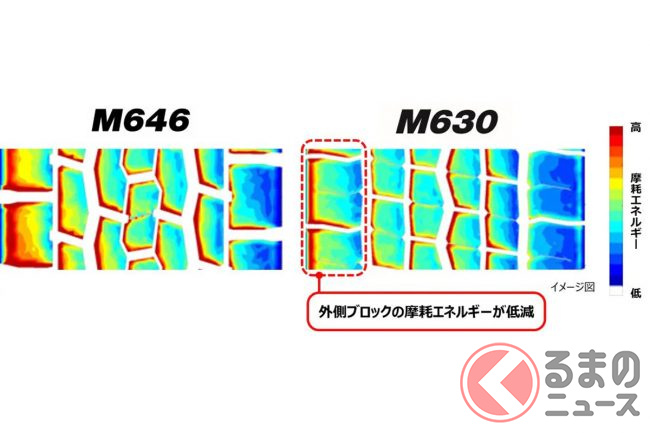 M630ではショルダーブロック幅やトレッド幅を拡大した新パターンを採用し、ブロックの変形を効果的に抑制。これにより、交換サイクルの短期化を招く肩落ち摩耗を同社従来品「M646」比で61%低減し、優れた耐偏摩耗性能を実現したとのことです。