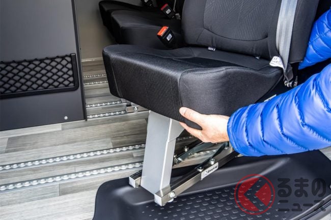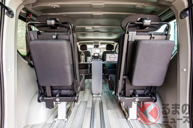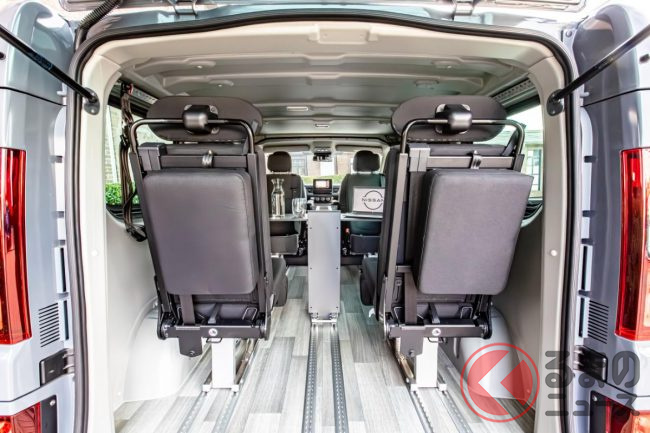 さらに、利便性を高める装備としてカップホルダー付きビジネステーブルやスライドドアからの乗降をサポートする電動ステップ、フック付きレールなどのオプションも用意しています。シートのバリエーションにはリクライニング機能を省いたものもあります。