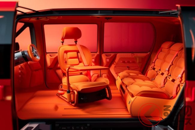 これによりドライバーは180度のパノラマ視界を得られるほか、後席の乗員ともコミュニケーションが取りやすい設計となっています。2列目には、横並びに3人が座れるベンチシートが配置されており、通常時は前1人+後ろ3人というレイアウトをとります。