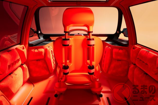 ここからがELOの真骨頂です。6人乗車が必要な場合、2列目の左右シート下に隠された2つの追加シートを展開します。この追加シートは、中央の運転席の斜め後ろ(運転席と2列目の間)に展開される仕組みになっており、これにより1列目(1人)+補助席(2人)+2列目(3人)という、極めて斬新な1+2+3の6人乗りレイアウトが完成します。