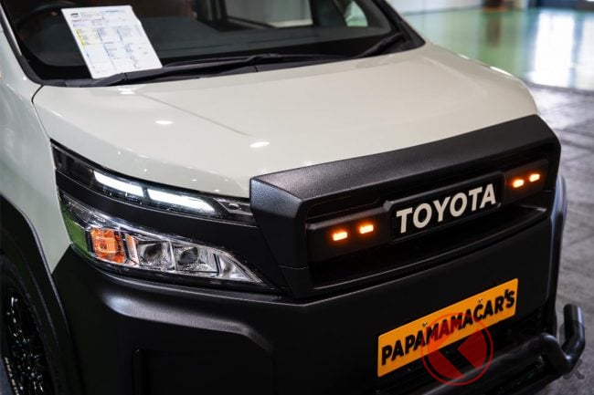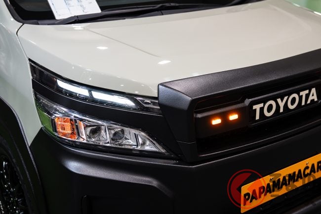 展示車の外観は、落ち着いたベージュカラーを基調に、中央にオレンジLEDライトを内蔵し、マットブラック仕上げられたグリルやグリルガードも相まって無骨でアウトドア感を演出。