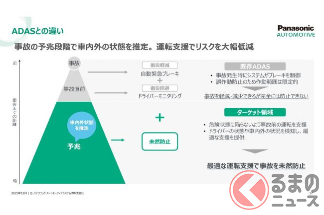 現在のADASは、事故の直前にブレーキ制御を行うもので、誤作動防止のため作動範囲も限定的になっています。