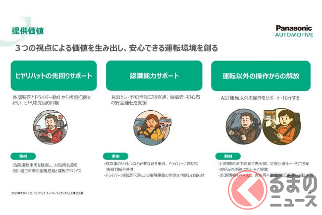 安心できる運転環境をつくるために、外部要因とドライバー動作から状況を把握を行い、運転で起こるリスクを先回りして抑制する「ヒヤリハットの先回りサポート」、見落としやすい予測ミスなどを防ぎ、高齢者、初心者などの安全運転を支援する「認識能力サポート」、AIがナビゲーション操作や外部への連絡など、運転以外の操作をサポート、代行する「運転以外の操作からの解放」という3つの価値を提供。
