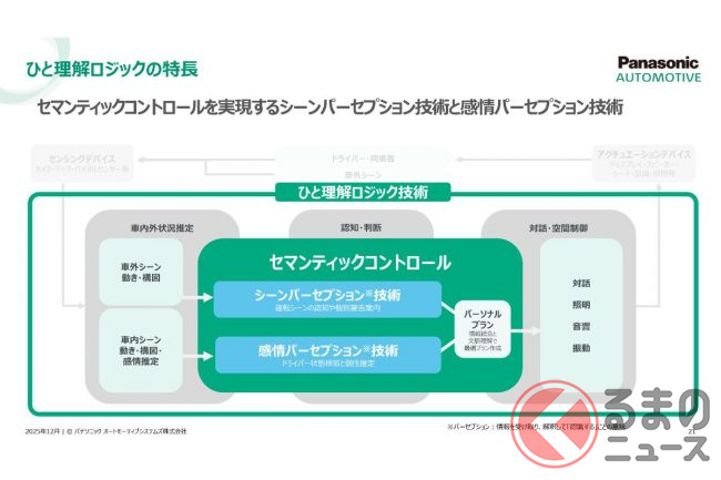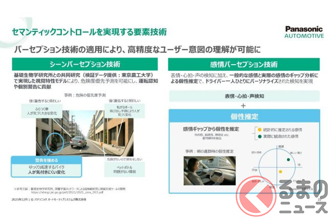これは、運転シーンを認知し、危険の優先度を予測することで、状況やドライバーに合わせた警告や案内を可能にする「シーンパーセプション技術」と、ドライバーの状態や個性を推定し、より精度の高い運転支援を提供する「感情パーセプション技術」を組み合わせ実現するものです。
