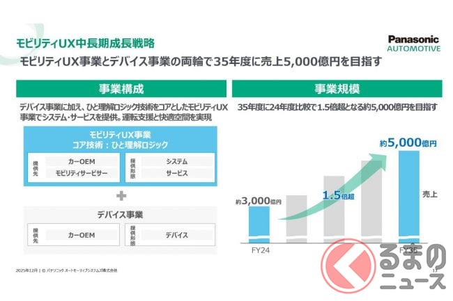 モビリティUXにおいては、2035年度までに売上高を現在の1.5倍超となる約5000億円まで拡大することを目指し、同社が培ってきた「ひと理解」の知見をもとに、センシングやAI、アルゴリズムで「移ごこち(心地よい移動)」を創出します。