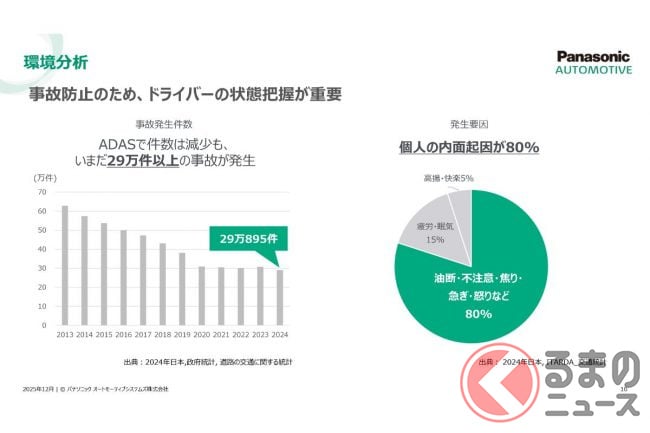 要因の約80%は、油断や不注意、焦りなど、ドライバーの内面的な感情に起因しており(出典:ITARDA「交通統計」2024)、事故を防止するためには、ドライバーを中心とした車内外の状況把握と、それに対する支援が重要です。