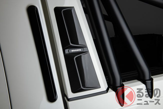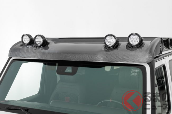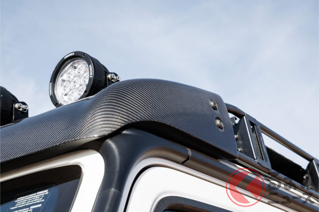 エクステリアは、ブラバスらしい「アドベンチャー」な装備で武装されています。フロントバンパーには大型のブラシガードと、最大4500kgの牽引能力を持つウインチを内蔵。ルーフには風切り音を抑えるデフレクター機能付きのカーボン製ライトバーが備わり、夜間のオフロード走行を強力にサポートします。