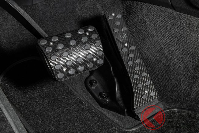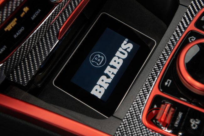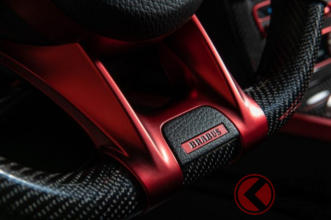 デモカーの内装は、最高級のブラックレザーとダイナミカ(マイクロファイバー)を組み合わせ、随所にカーボンパネルを配置した精悍なデザインを採用。シートやドアパネルには、ブラバスの伝統的な「ヘリテージブランド」パターンと、立体的な「77」のエンボス加工が施され、創業年である1977年への敬意を表しています。