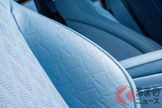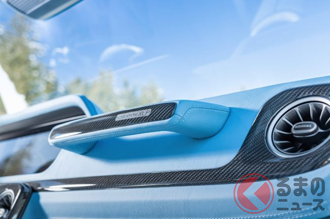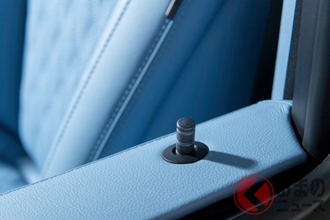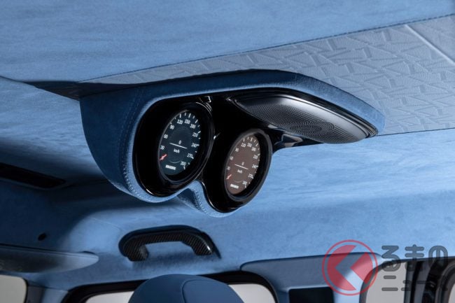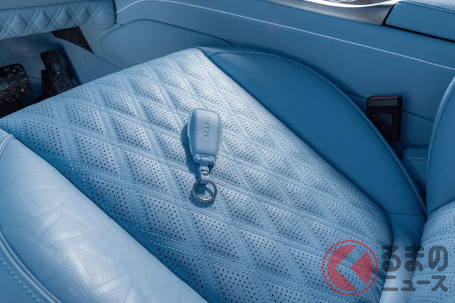 デモカーの内装は、ブラックのエクステリアとは対照的な、鮮烈な「スカイブルー」のレザーとアルカンターラで統一。シート表面には精密な「ダイヤモンド・ダブル」キルトが施され、創業年である「77」のエンボスロゴが歴史への敬意を表しています。