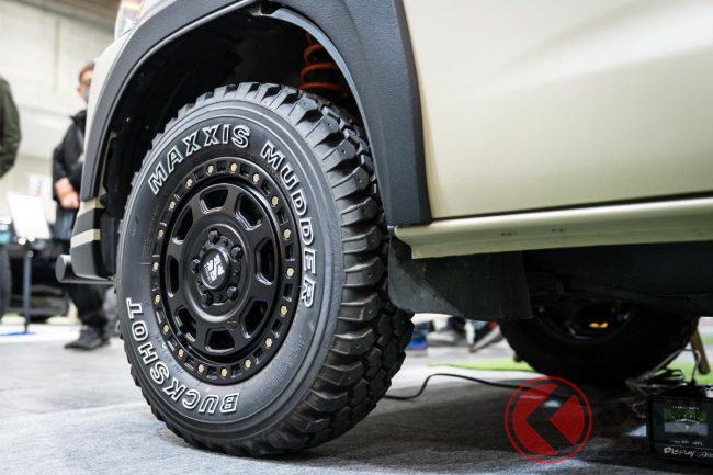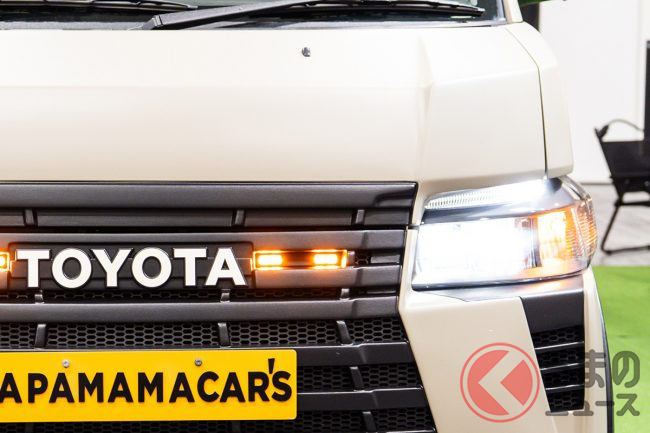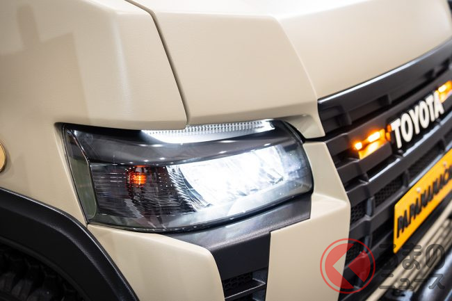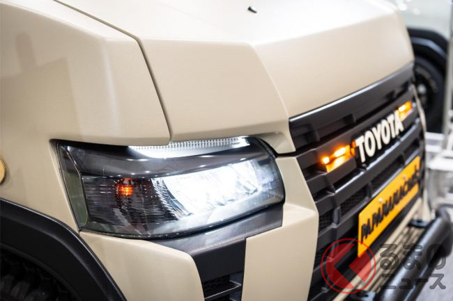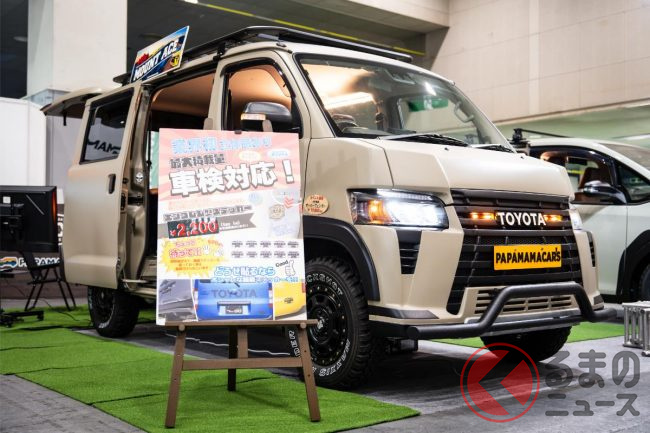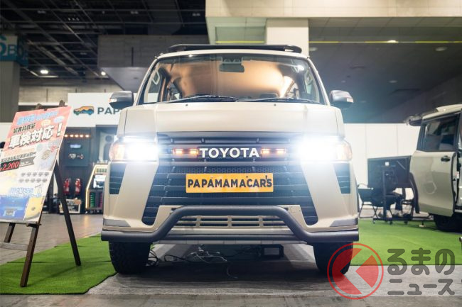 フロントフェイスはレクサスの人気SUV「GX」を彷彿とさせる力強い造形で、バンパーガードやアルミホイール、マッドタイヤと組み合わせることで、商用バンの枠を超えた存在感を放っています。