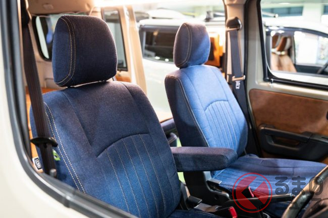 内装はヴィンテージ感のあるデニムカバーや木目調パネルなどを組み合わせ、温かみのある空間を演出。リアスピーカーパネルも備え、車内で過ごす時間を豊かにする工夫が随所に見られます。