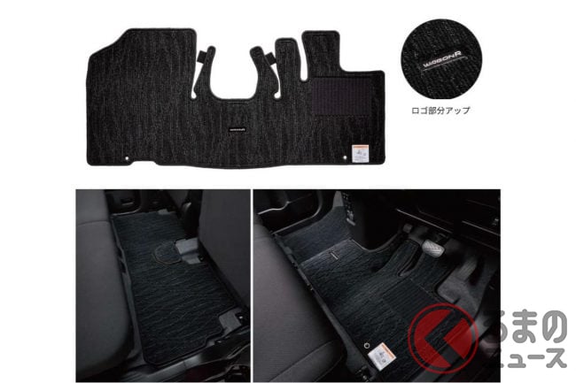 フロアマット(リップル)は、運転席、助手席、後席でそれぞれに合わせた形状で作られ、「ワゴンR」のロゴや運転席のペダル付近には専用マットを備えます。