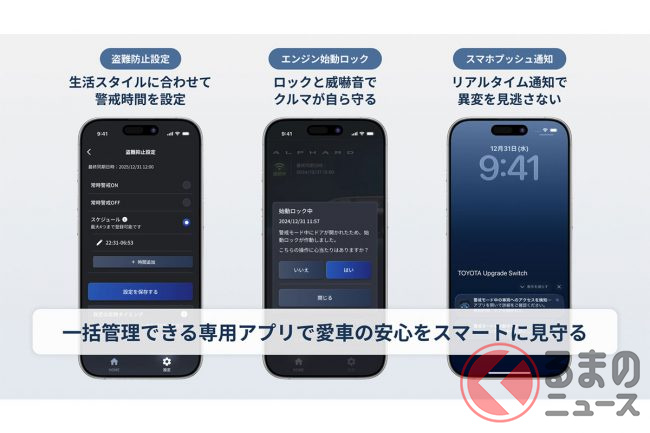 またこれに合わせ、昨今社会問題化している“自動車盗難”の手口に対応した新たなセキュリティアイテムとなる「Smart Upgrade Switchセキュリティシステム」の販売を開始したほか、2026年春頃にはさらに高度な機能を持つ「セキュリティシステム プレミアム」の取り扱いを、トヨタとレクサスのUPGRADE FACTORYで開始する予定だと明らかにしました。