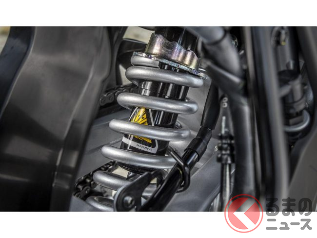 サスペンションも本格的なスペックが与えられ、フロントフォークはインナーチューブ径41mmのKYB製を採用し、215mmという長いストローク量を確保しました。
